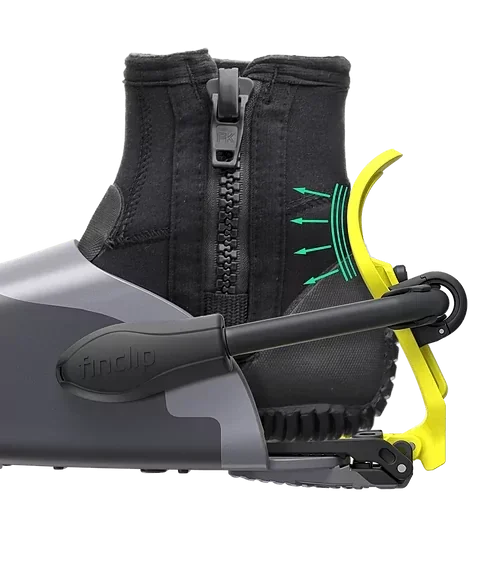 Finclip fixes to the base of the fin with a serrated clamp hinged to an ergonomic heelpiece. This features a grooved track and a sliding cursor to tension the bungee cord that allows the heelpiece to hold the fin firmly in place during diving.