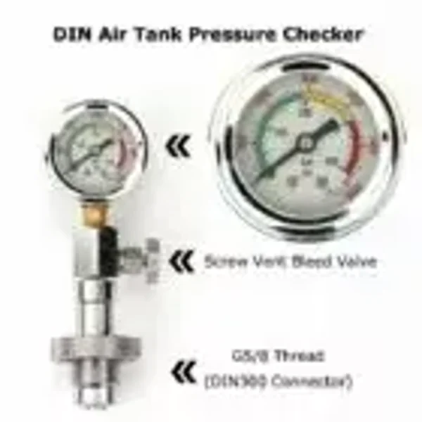 Druktester tot 300bar voor duik- en schietsport cylinders met 50mm manometer en 5/8 din aansluiting.