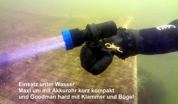 De MAXI uni lampkop kan met alle aangeboden LED-modules worden gebruikt. Door gebruik te maken van de korte compacte accubuis is de brandtijd 3x zo lang (als er 3 21700 accu's in de accutank zitten) - vergeleken met de MAXI uni met 1 21700 accu